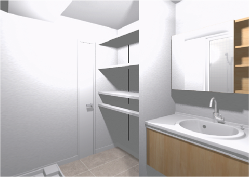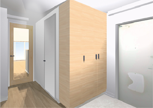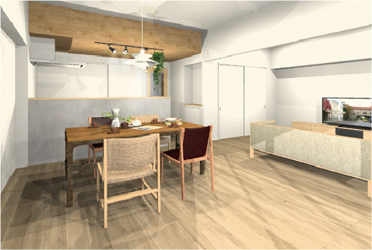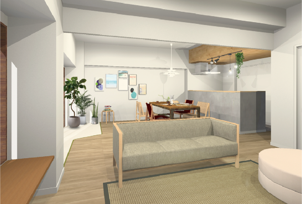 この事例では、工事前に3Dで空間全体を確認しながら、間取りや広がり、使い方を具体的に整理してから計画を進めました。 以下では、検討時の3Dパースと、実際の完成写真を並べてご紹介します。